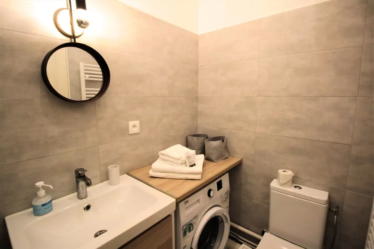 Im Anschluss an das Wohnzimmer gelangt man über den Flur in das Badezimmer mit Badewanne, Waschbecken, Toilette, Waschmaschine und Handtuchtrockner.
