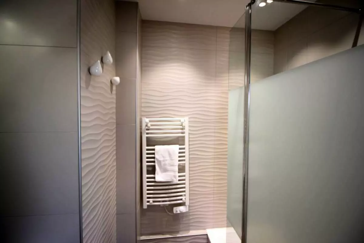 Das ruhige und komfortable Hauptschlafzimmer verfügt über ein Doppelbett, einen Schreibtisch und Stauraum. Das angrenzende Badezimmer ist mit einer großen Dusche, einem Waschbecken und einem beheizten Handtuchhalter ausgestattet. Vom Balkon aus hat man Blick auf den Garten gegenüber.